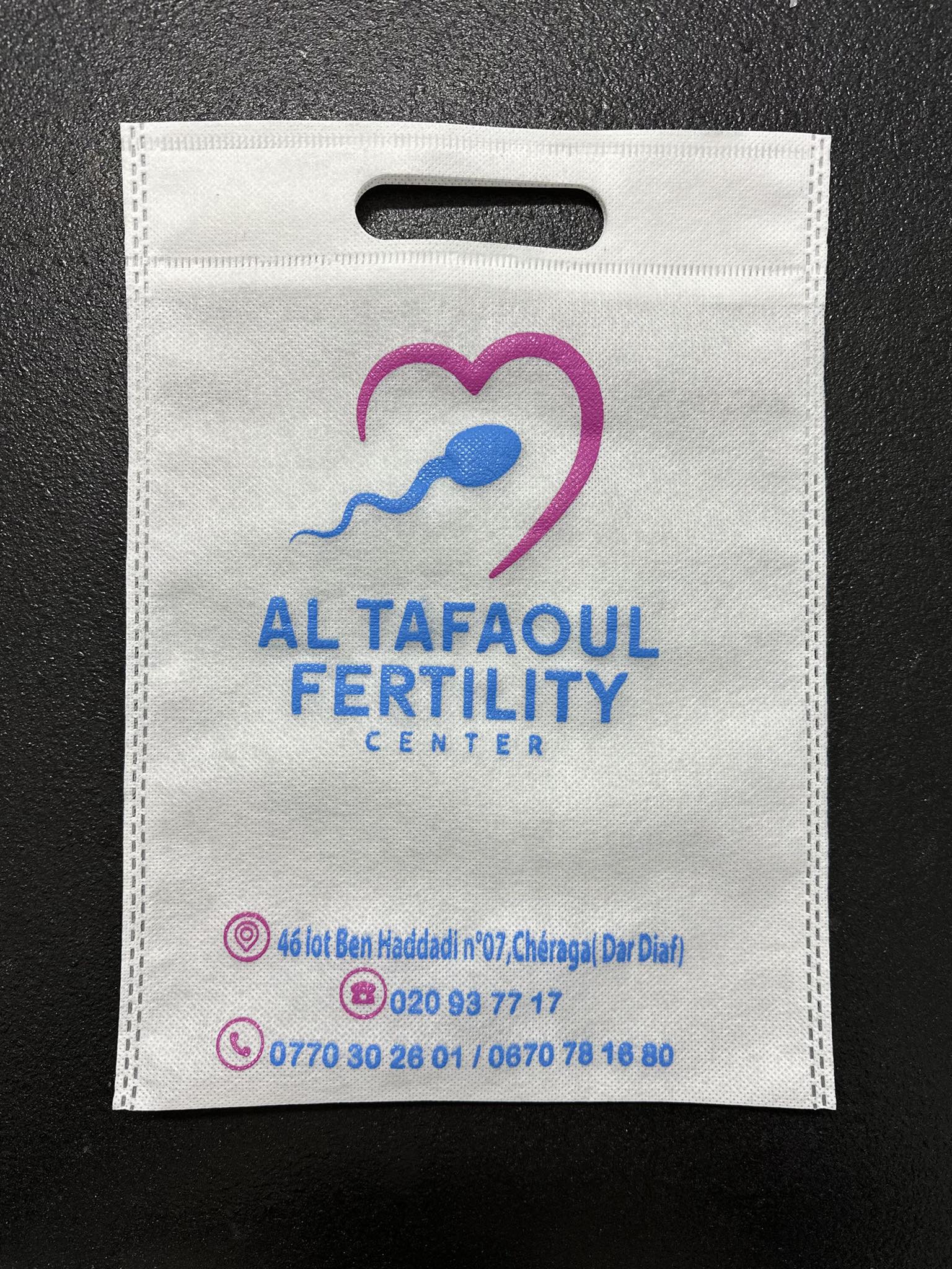 صباح التفاؤل 🛍️ Commande réalisée Sacs TNT 22×30 cm en blanc, avec personnalisation bleu et rose, réalisés pour le Centre de fertilité AL TAFAOUL. Merci pour votre confiance 🤍 Contactez-nous pour vos commandes et projets