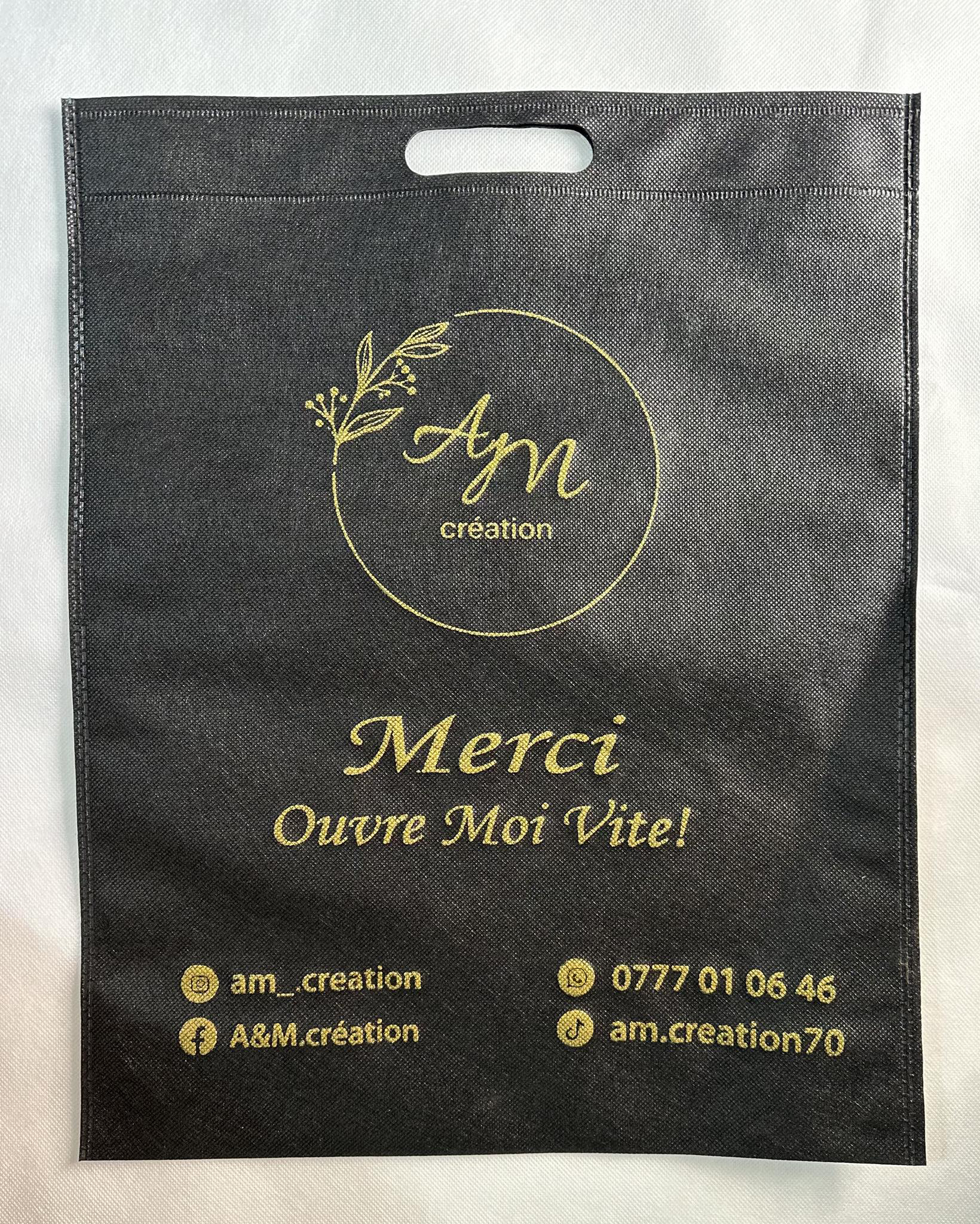 ✨ Réalisation du jour ✨ Nous vous présentons notre réalisation du jour : des sacs TNT noirs, format 35×45 cm, personnalisés en sérigraphie dorée ✨ 👉 Pour la boutique AM Création • Logo élégant • Mention « MERCI » • Coordonnées intégrées Un rendu chic et professionnel, parfait pour valoriser l’image de marque 🖤💛